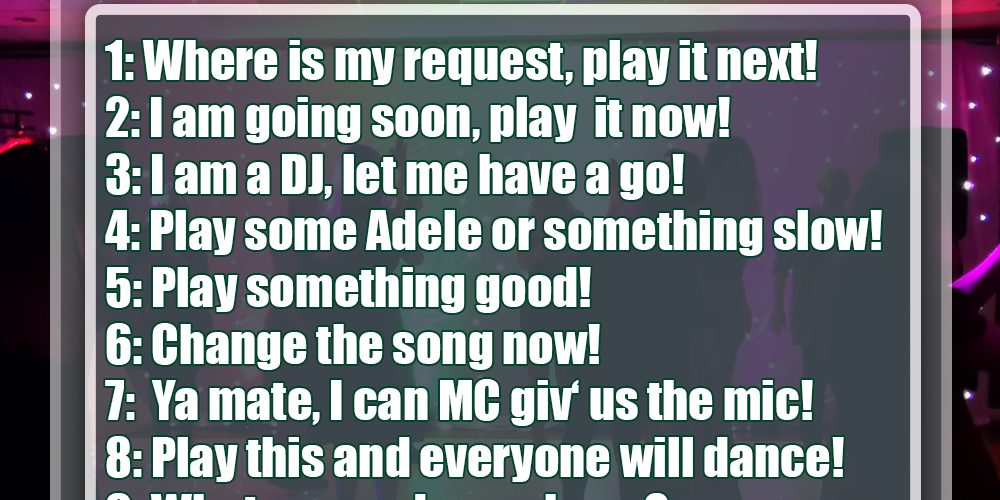 So it’s Christmas Party Season, the once-a-year drinkers are out in force and unfortunately we DJ’s have to deal with the rude and abusive behavior from a very small amount of the party-goers. Here is a simple list of what NOT to say to a DJ when they are working hard to ensure the majority are having a good time. Before approaching the DJ, please think about the manner or tone of your question that would be acceptable in your job? DJs are only human and don’t be surprised if they bite back, embarrass you over the microphone or even turn off the music until you are removed from the venue.